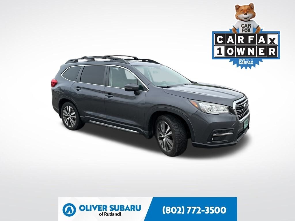 Oliver Subaru of Rutland is proud to present you with another True Market Priced Pre-Owned Vehicle. This 2019 Subaru Ascent Limited is loaded with the following Factory Options: 20" Alloy Wheels, 4-Wheel Disc Brakes, CD player, Radio: Subaru STARLINK 8.0" Multimedia Nav System, and Steering wheel mounted audio controls harman kardon & Moonroof & Nav & Cargo Area Cover (Radio: Subaru STARLINK 8.0" Multimedia Nav System, Cargo Area Cover, and Dual Glass Panoramic Power Moonroof), 20" Alloy Wheels, 4-Wheel Disc Brakes, CD player, Steering wheel mounted audio controls, 3rd row seats: bench, 6 Speakers, ABS brakes, Air Conditioning, Alloy wheels, AM/FM radio: SiriusXM, Auto High-beam Headlights, Auto-dimming Rear-View mirror, Automatic temperature control, Axle Ratio: 4.44, Brake assist, Bumpers: body-color, Compass, Delay-off headlights, Driver door bin, Driver vanity mirror, Dual front impact airbags, Dual front side impact airbags, Electronic Stability Control, Emergency communication system: STARLINK Safety and Security, Exterior Parking Camera Rear, Four wheel independent suspension, Front anti-roll bar, Front Bucket Seats, Front Center Armrest, Front dual zone A/C, Front fog lights, Front reading lights, Fully automatic headlights, Garage door transmitter: HomeLink, Heated door mirrors, Heated Front Bucket Seats, Heated front seats, Heated rear seats, Heated steering wheel, Illuminated entry, Knee airbag, Low tire pressure warning, Memory seat, Occupant sensing airbag, Outside temperature display, Overhead airbag, Overhead console, Panic alarm, Passenger door bin, Passenger vanity mirror, Perforated Leather-Trimmed Upholstery, Power door mirrors, Power driver seat, Power Liftgate, Power passenger seat, Power steering, Power windows, Radio data system, Radio: Subaru STARLINK 8.0" Multimedia Plus System, Rear air conditioning, Rear anti-roll bar, Rear reading lights, Rear seat center armrest, Rear window defroster, Rear window wiper, Remote keyless entry, Roof rack: rails only, Security system, Speed control, Split folding rear seat, Spoiler, STARLINK/Apple CarPlay/Android Auto, Tachometer, Telescoping steering wheel, Tilt steering wheel, Traction control, Trip computer, and Variably intermittent wipers!!
