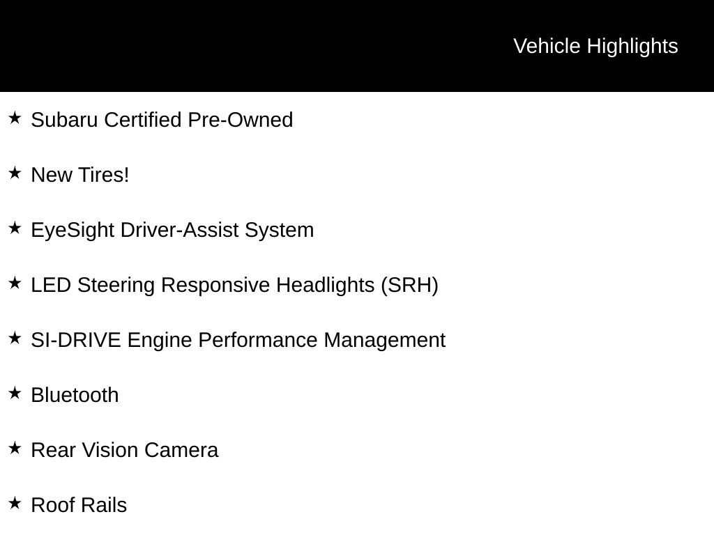 Subaru Certified Pre-Owned, New Tires!, EyeSight Driver-Assist System, LED Steering Responsive Headlights (SRH), SI-DRIVE Engine Performance Management, Bluetooth, Rear Vision Camera, Roof Rails, Adaptive Cruise Control, High Beam Assist (HBA), Auto Climate Control, Splash Guards, Rear Bumper Cover, 4-Wheel Disc Brakes, CD player, Four wheel independent suspension, Radio: Subaru Starlink 6.5" Multimedia Plus System, Steering wheel mounted audio controls, Wheels: 17" x 7.0 J Silver Finish Aluminum-Alloy.