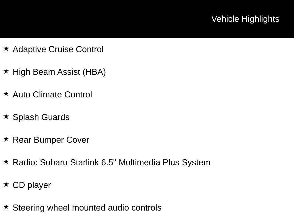 - Radio: Subaru Starlink 6.5" Multimedia Plus System