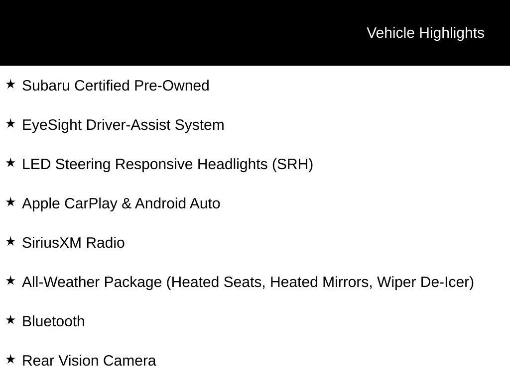 Subaru Certified Pre-Owned, EyeSight Driver-Assist System, LED Steering Responsive Headlights (SRH), Apple CarPlay & Android Auto, SiriusXM Radio, All-Weather Package (Heated Seats, Heated Mirrors, Wiper De-Icer), Bluetooth, Rear Vision Camera, Adaptive Cruise Control, High Beam Assist (HBA), Body Side Molding, 4-Wheel Disc Brakes, Four wheel independent suspension, Radio: Subaru Dual 7" Multimedia System, Steering wheel mounted audio controls, Wheels: 16" x 6.0" 1/2J Steel w/Full Cap.